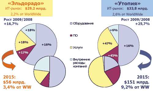 В сценарии «Утопия»2 (цены на энергоносители растут, экономический и политический режим — национальная модернизация) объем ИТ-рынка России в 2009 году составит 33,8 млрд. долл. (2,6% от мирового) с годовым темпом роста +27,7%. Его структура будет следующей: оборудование — 50,2% (темпы роста +16%); ПО — 15,5% (+45%); ИТ-услуги — 25,6% (+47%); внутренние расходы компаний на ИТ — 8,7% (+6%). К 2015 году развитие российского ИТ-рынка по данному сценарию приведет к следующей его структуре: оборудование — 18,3%; ПО — 22,3%; ИТ-услуги — 57,9%; внутренние расходы компаний на ИТ — 1,6%. Суммарный объем российского ИТ-рынка возрастет до 151 млрд. долл. (9,2% от мирового).