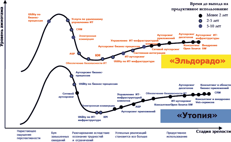 Отметим, что данная схема перекликается со схемой прогнозирования развития ИТ-рынка в России, представленной в докладе Ольги Дергуновой (компания Microsoft) в Высшей школе экономики в 2005 году (рис. 6).