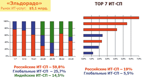 Объем российского рынка ИТ-услуг по сценарию «Эльдорадо» в 2009 году составит 5,1 млрд. долл. (0,64% от мирового) с годовым темпом роста +18%. Структура рынка ИТ-услуг будет следующей: поддержка оборудования — 11,3% (темпы роста — +19%); поддержка ПО — 14% (+20%); консалтинг — 9,2% (+20%); разработка и интеграция — 51,6% (+16%); ИТ-менеджмент — 23% (+18%); БП-менеджмент (менеджмент бизнес-процессов) — 3,5% (+22%). К 2015 году развитие российского рынка ИТ-услуг по данному сценарию приведет к следующей его структуре: поддержка оборудования — 9,5%, поддержка ПО — 13,4%, консалтинг — 10,6%, разработка и интеграция — 48,5%, ИТ-менеджмент — 12,8%, БП-менеджмент — 5,2%. Общий объем российского рынка ИТ-услуг составит 10 млрд. долл. (1% от мирового).