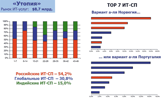 Объем российского рынка ИТ-услуг по сценарию «Утопия» в 2009 году составит 8,7 млрд. долл. (1,1% от мирового) и будет иметь годовые темпы роста +47%. Структура рынка ИТ-услуг будет такова: поддержка оборудования — 8,4% (темпы роста — +30%); поддержка ПО — 11,7% (+35%); консалтинг — 11,6% (+65%); разработка и интеграция — 48,8% (+38%); ИТ-менеджмент — 13,5% (+80%); БП-менеджмент — 6% (+90%). При развитии российского рынка ИТ-услуг по данному сценарию к 2015 году его структура станет следующей: поддержка оборудования — 2,8%, поддержка ПО — 4,3%, консалтинг — 9,4%, разработка и интеграция — 26,6%, ИТ-менеджмент — 35,7%, БП-менеджмент — 21,3%. Общий же объем российского рынка ИТ-услуг составит 88 млрд. долл. (9% от мирового).