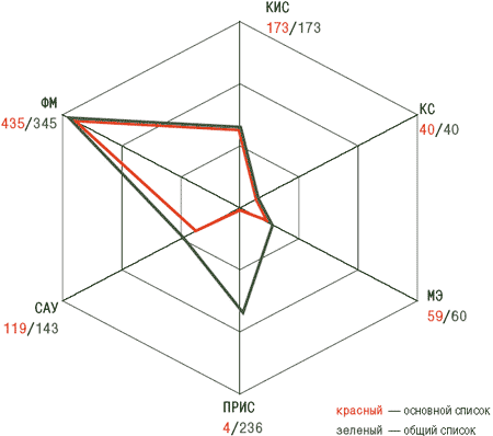 Рис. 11. Распределение вузов, готовящих ИКТ-специалистов, по областям профессиональной деятельности в сфере ИКТ. Результаты исследования приведены как для основного списка ИКТ-специальностей (выделены красным цветом), так и для общего списка (выделены зеленым цветом) (источник — Интернет-университет информационных технологий, 2006)