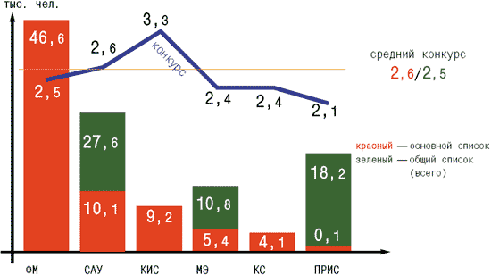 Рис. 12. Количество абитуриентов, поступивших на первый курс, и конкурс на место по областям профессиональной деятельности в сфере ИКТ в 2005 году (источник — Интернет-университет информационных технологий, 2006)