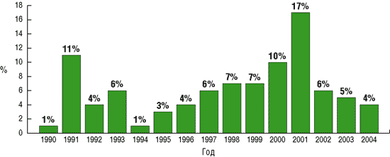 Рис. 14. Количество офшорных компаний (в %), основанных с 1990-го по 2004 год (источник — www.outsourcing-Russia.com)