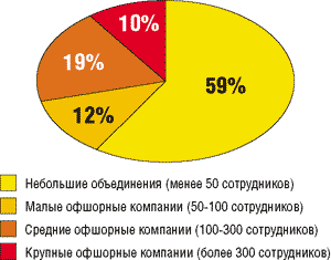 Рис. 16. Распределение офшорных компаний по количеству сотрудников (источник — www.outsourcing-Russia.com)