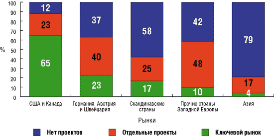 Основными рынками, на которых работают российские офшорные компании, являются американский (США и Канада) и европейский (Германия, Австрия, Франция, скандинавские страны и пр.). На этих рынках офшорные компании получают большую часть своей прибыли. Присутствие российских офшорных компаний на азиатских рынках (Япония, страны Юго-Восточной Азии) незначительно (рис. 17).