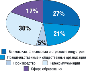 Заказ на выполнение разработки ПО может, конечно, прийти из любой сферы. Однако традиционно российские офшорные компании специализируются на выполнении заказов для финансовых, страховых, телекоммуникационных компаний, различных государственных учреждений и в сфере образования (рис. 18).