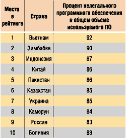Статистика по странам с наивысшим уровнем пиратства приведена в табл. 3. Если в последние годы Россия входила в пятерку лидеров, то теперь она едва вошла в десятку. Уровень пиратства с 87% в 2004 году упал до 83% в 2005-м. Самая «пиратская» страна по ситуации на 2005 год — Вьетнам. Здесь 92% программного обеспечения продается без лицензий.