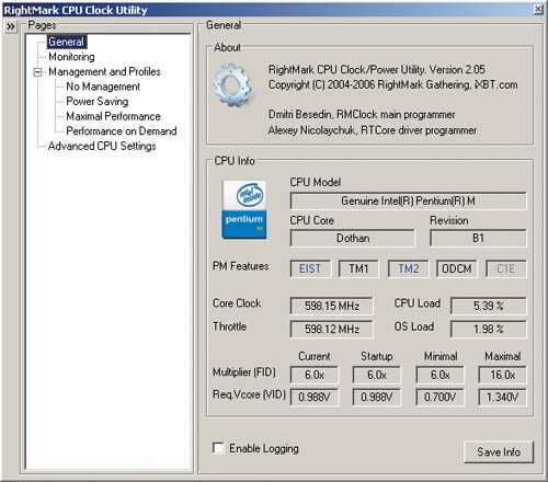 В дальнейшем мы рассмотрим возможности утилиты RMClock на примере версии 2.05. С ее помощью мы настроим ноутбук на основе мобильного процессора Intel Pentium M 1,6 ГГц (Dothan).