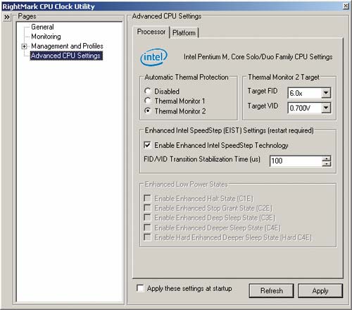 Отметим, что утилиту RMClock можно использовать не только для настройки ноутбуков на базе мобильных версий процессоров, поддерживающих технологию Enhanced Intel SpeedStep. Данная утилита поддерживает также процессоры AMD с технологией Cool & Quite. Кроме того, все современные процессоры для настольных ПК поддерживают технологию Enhanced Intel SpeedStep или Cool & Quite, и в данном случае утилита RMClock может служить прекрасным инструментом для создания малошумных систем.