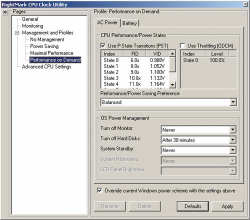Окно Management and Profiles предназначено для настройки схем энергопотребления процессора (рис. 6). Здесь можно выбрать схему энергопотребления процессора при питании от сети (AC Power Profile) и при работе от аккумуляторной батареи (Battery Profile). Всего предусмотрено четыре схемы энергопотребления: No Management, Power Saving, Maximal Performance и Performance on Demand. Отметим, что данные схемы подменяют собой схемы питания, настраиваемые средствами операционной системы.