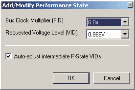 После того как найдено напряжение для состояния State 0, можно приступить к подбору напряжения для рабочей точки, соответствующей максимальному коэффициенту умножения. В нашем случае это состояние State 7 с коэффициентом умножения 16.0х и напряжением 1,34 В. Обратите внимание, что при изменении напряжения в состоянии State 0 также меняется напряжение во всех промежуточных рабочих точках, кроме последней. Для того чтобы изменить напряжение во всех промежуточных рабочих точках, необходимо отметить пункт Auto-adjust intermediate P-State VIDs в окне Add/Modify Performance State.