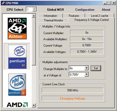 Еще одна позволяющая задавать соотношение между коэффициентом умножения процессора и напряжением питания утилита — это CPUMSR (www.cpuheat.wz.cz). Текущая версия утилиты 0.9 имеет ряд существенных ограничений в сравнении с утилитой RMClock. Фактически же в данном случае речь идет не о возможности корректировки таблицы соответствия коэффициентов умножения и напряжения питания, а о возможности задания для отдельного коэффициента умножения напряжения питания.