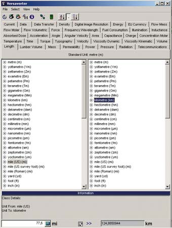 - длина и расстояние — меры длины, включая метрическую, британскую и американскую, японскую, тайскую, старорусскую, древнегреческую и римскую; морские, типографские и астрономические единицы;