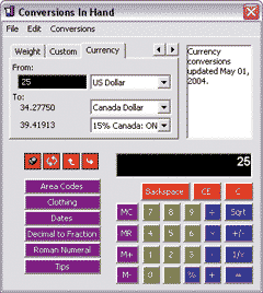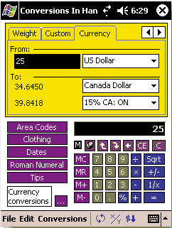 Наверняка многим пользователям КПК понравится мощный конвертор единиц измерения Conversions In Hand (CIH, текущая версия — 3.5), который поддерживает более 200 типов данных, включая валюты разных стран. Поскольку курсы валют быстро меняются, вы можете обновлять параметры настройки перевода валют из Интернета, легко загружая обновленный файл кросс-курсов с Web-сайта компании-производителя CIH — BurrOak (http://www.burroak.on.ca) или корректировать курс вручную. База валют у CIH автоматически обновляется, но обновление можно загрузить и вручную по адресу: http://www.burroak.on.ca/cih_curr.txt. Как и Versaverter, CIH программа имеет встроенный калькулятор.
