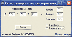 Помимо распространенных конверторов и калькуляторов имеются и весьма редкие, специализированные ресурсы. Например, при покупке автомобиля можно использовать универсальный кредитный калькулятор для автокредитования (http://lotus.psbank.ru/DocFlow/credit.nsf/CarCreditCalc?OpenForm). Для автомобилистов в Сети существуют также многочисленные онлайновые шинные калькуляторы (http://www.miata.net/garage/tirecalc.html или http://www.intershina.ru/tire_calc.php). На них можно рассчитать размеры колеса по его маркировке при замене шин и убедиться, что новая резина встанет на диски, а одометр будет давать правильные показания. Если лазить в Интернет за вычислениями неудобно, то можно скачать шинный калькулятор на ноутбук или на КПК. Для ПК есть, например, бесплатный калькулятор Алексея Лебедева (http://freesoft.ru/pageview.html?id=9810&dl=0).