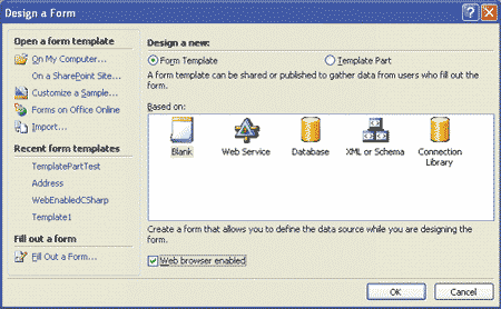 Дизайнер шаблонов работает в трех режимах: режиме обратной совместимости с InfoPath 2003, режиме поддержки только InfoPath 2007 и режиме поддержки InfoPath 2007 и служб Forms Services. В последнем случае созданные средствами дизайнера форм шаблоны (файлы с расширением *.xsn) могут быть преобразованы в формы, доступные для заполнения в Web-браузере. Для этого достаточно включить опцию Web Browser Enabled в диалоговой панели Design a Form (рис. 1).