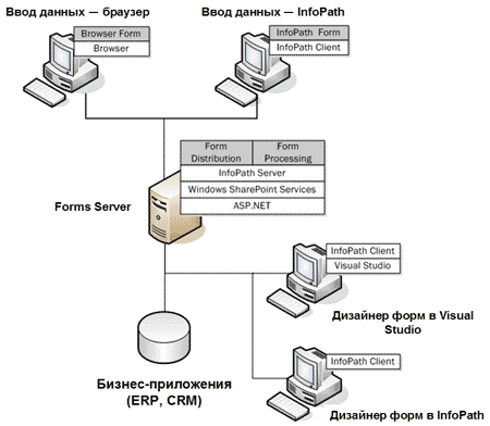 Для поддержки различных сценариев работы с формами в состав Microsoft Office 2007 включен новый серверный продукт — Microsoft Office Forms Server. В его задачу входит обеспечение возможности заполнения форм InfoPath с помощью обычного Web-браузера — от пользователей не требуется устанавливать клиентское приложение InfoPath. Эта функциональность построена на основе платформы Microsoft Windows SharePoint Services 3.0.