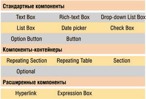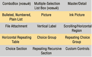 Для форм, которые предполагается использовать в Web-браузере, поддерживаются следующие интерфейсные элементы: