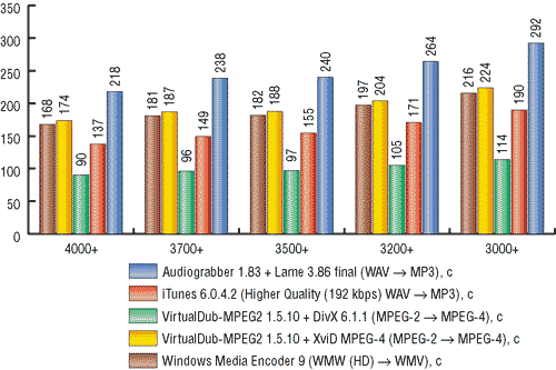 Очевидно, что во всех тех случаях, когда увеличение кэша L2 не приносило никаких дивидендов, в частности при выполнении задачи по конвертированию аудио- и видеофайлов (рис. 3), увеличение тактовой частоты приводило к росту производительности системы.