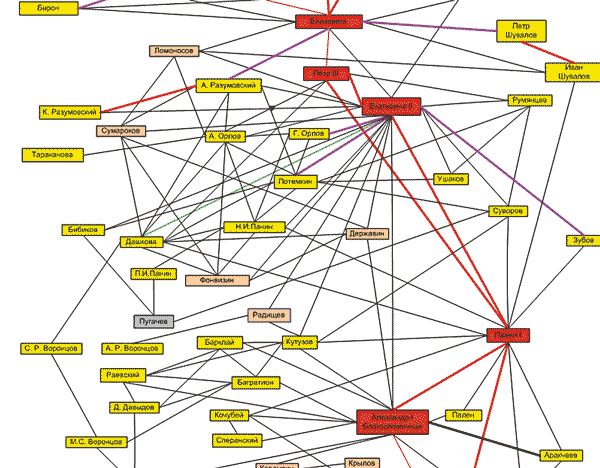 Одним из направлений анализа социальных сетей является визуализация соответствующих графов. Визуализация имеет важное значение, поскольку сама возможность увидеть сеть позволяет сделать важные выводы о характере взаимодействия акторов, не прибегая к другим методам анализа графа. В качестве примера на рис. 2 показан граф взаимодействий исторических личностей. Интерактивную версию графа можно найти по адресу: http://www.sna-history.narod.ru/, статья, посвященная визуализации социальных сетей, находится на прилагаемом к журналу CD-диске.