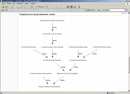 Ресурс Letopisi.ru (рис. 16) нельзя напрямую отнести к сервису по построению социальной сети. Однако один из его разделов — проект «Моя семья!» — позволяет внести в историю летопись вашей семьи, которая впоследствии будет расширяться и дополняться новыми сведениями, которые будут нужны и важны вашим потомкам. В этом смысле сервис можно отнести к услугам по построению социальной сети. Для отражения хода проекта используется Wiki-технология, имеется возможность графического отображения построенной семейной социограммы (рис. 17). Проект призван привлечь внимание к семейным ценностям в современном обществе.