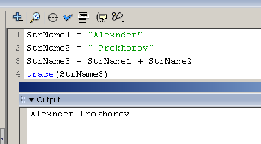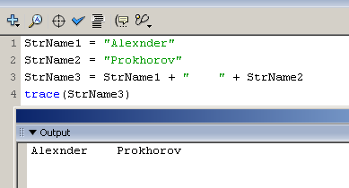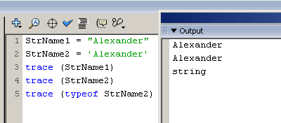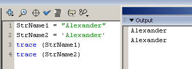 В примере, приведенном на рис. 1, для присвоения значения переменной StrName1 используются двойные кавычки, а для переменной StrName2 — одинарные. Как видно в панели Output, результат получается одинаковый.