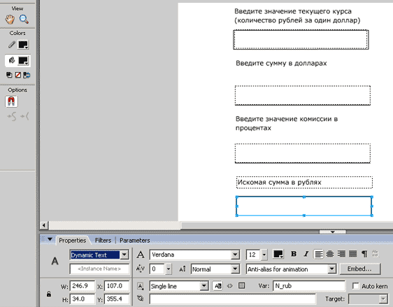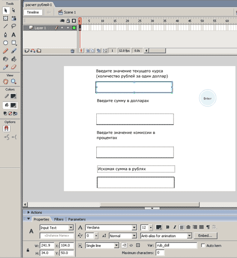 Для создания поля ввода, воспользуемся инструментом Text tool, в панели Properties выберем режим Input Text, выбираем обозначение переменной, которой будет присваиваться текст, вводимый пользователем. В нашем случае мы назвали ее rub_dol (рис. 15).