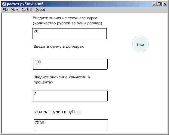 Значение текущего курса (количество рублей за доллар) будем вводить, используя поле ввода данных — текстовый блок, содержимое которого может заполняться пользователем во время воспроизведения Flash-документа.