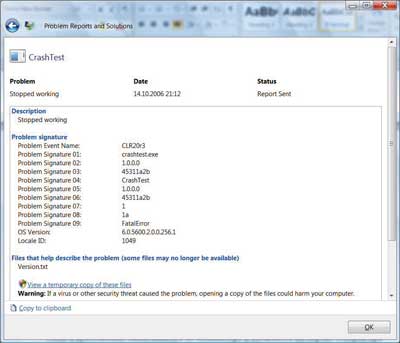 Обычный набор данных включает название приложения (например, winword.exe), версию приложения (например, 10.0.2627.0), имя модуля (например, mso.dll), версию модуля (например, 10.0.2613.1) и смещение внутри модуля (например, 0003cbb). Во все отчеты автоматически включается информация о языке и идентификаторе страны (LocaleID) и номере версии операционной системы.