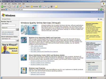 Данные, собранные о приложении, в котором произошел сбой, отсылаются на специальный портал Windows Quality Online Services (рис. 7), расположенный по адресу: https://winqual.microsoft.com/. Любая компания, производящая программное обеспечение, может бесплатно зарегистрироваться на этом портале и получать информацию о сбоях в своих приложениях. Единственная затрата — приобретение сертификата у компании Verisign (на момент написания данного обзора обсуждалась возможность снижения цены сертификата для компаний, использующих сервисы WinQal, с 399 до 99 долл.).