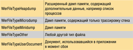 Для включения в состав отчета файла используется функция WerRegisterFile(), которой в качестве параметров передаются: полное имя файла, его тип (одно из значений WER_REGISTER_FILE_ TYPE) и два флага — WER_ DELETE_FILE_WHEN_DONE, указывающий на то, что файл должен быть удален после отсылки отчета, и WER_ANONYMOUS_ DATA, указывающий на то, что в файле не содержатся приватные данные. Возможные значения параметра WER_REGISTER_FILE_ TYPE приведены в таблице.