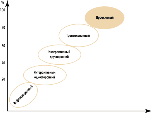 - Проактивный (Targetisation) — означает 100%-ное веб-присутствие и отличается тем, что правительство не только предоставляет гражданам и коммерческим структурам сервисные услуги, но и привлекает граждан к принятию решений и двустороннему диалогу на базе интерактивных сервисов.