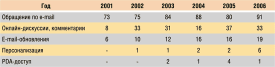 Таблица 1. Формы интерактивного присутствия в 2001-2006 годах