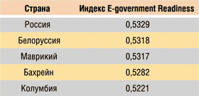 Уровень развития ЭП, или, как принято говорить, уровень его зрелости, в разных странах различен: одни находятся в авангарде и предоставляют гражданам разнообразные онлайновые сервисы, другие пока ограничиваются информационным уровнем взаимодействия. Главным показателем зрелости ЭП является индекс E-government Readiness Index, ежегодно рассчитываемый ООН для всех стран — членов ООН и в комплексе учитывающий уровень развитости веб-услуг, развития телекоммуникационной инфраструктуры и готовность граждан пользоваться информационными услугами. Десятка стран — лидеров по степени зрелости ЭП приведена в табл. 3. У России индекс E-government Readiness равен 0,5329, и по степени зрелости ЭП она находится на уровне Белоруссии и острова Маврикий (табл. 4).
