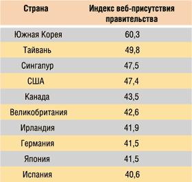В прошедшем году максимальный индекс ранжирования (60,3 балла) был у Южной Кореи — это означает, что каждый проанализированный южнокорейский веб-сайт имел больше половины признаков, важных для его информационной пригодности, свободного доступа граждан и предоставления сервисов. С заметным отставанием от Южной Кореи следуют Тайвань и Сингапур, и только потом очередь доходит до США, Канады и ведущих европейских стран (табл. 5). Россия стоит примерно в середине списка с индексом 31,9 (табл. 6), и, что интересно, ее индекс чуть выше, чем у таких передовых западноевропейских стран, как Дания (31,8), Австрия (30,6) и др. По всей видимости, сказалось выполнение программы «Электронная Россия», согласно которой все министерства и прочие правительственные структуры обязали разработать и поддерживать собственные веб-ресурсы. Это подтверждает и тот факт, что еще год назад в соответствующем отчете у России индекс правительственного веб-присутствия равнялся 24,2 и по данному показателю она не намного опережала Руанду и острова Самоа.