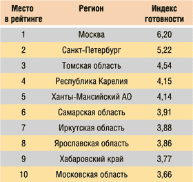 Регионам до уровня Москвы, конечно, далеко, хотя взглянуть на уровень их готовности к ЭП тоже интересно. Оказывается, за столицами следуют не те регионы, которые традиционно входят в первую десятку наиболее развитых в плане ИТ (в частности, Новосибирск, Нижний Новгород, Екатеринбург и т.д.), а, например, Ханты-Мансийский АО (табл. 10), что, по всей видимости, объясняется политикой благоприятствования развитию ЭП, проводимой в регионе. Данный индекс рассчитан по методике, схожей с методикой ООН, и складывается из оценки пяти параметров: ИКТ-инфраструктуры, доступа органов власти к ИКТ, доступа населения и бизнеса к ИКТ, уровня готовности населения (уровень образования, навыки применения ИКТ, мотивация использования Интернета и услуг электронного правительства).