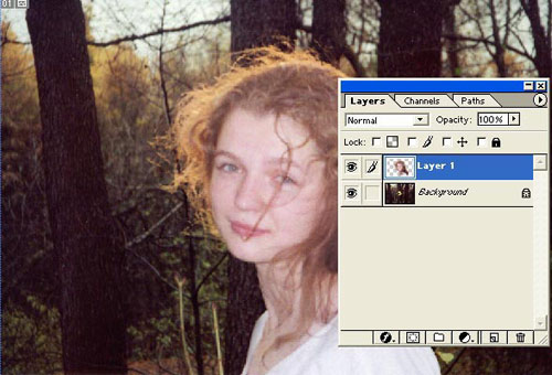 Обратите внимание, что после выполнения команды Paste каждое изображение (фон и портрет) находится на своем слое, и поэтому вы можете отдельно редактировать каждый слой. Если вы щелкнете в палитре (рис. 18) на изображении глаза в слое Layer1, изображение глаза исчезнет, а вместе с ним и изображение соответствующего слоя.