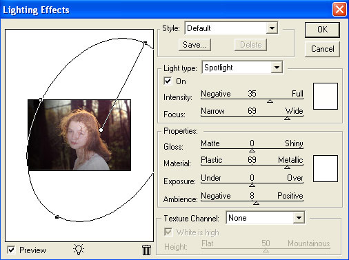 Изображение почти готово. Однако, если присмотреться, возникает вопрос: как при таком рассеянном освещении в лесу (на заднем плане) яркий свет падает на волосы? Для устранения несоответствия следует изменить освещенность заднего плана, применив еще один фильтр: Filter а Render а Lighting Effects.