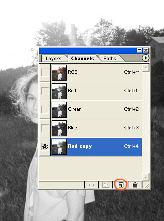 В панели Channels перетащите канал Red на пиктограмму Create New Channel (Создать новый слой) - на рис. 4 она выделена красным цветом. Как было отмечено ранее, для того чтобы сделать маску, мы должны сделать из изображения на рис. 3 черный передний план и белый фон. Для начала сделайте изображение инверсным с помощью команды Image а Adjust а Invert.