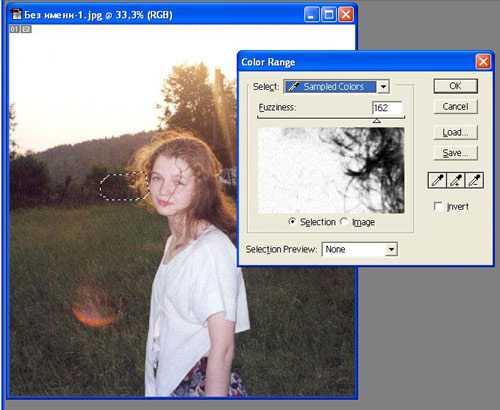 Существует способ, позволяющий сделать более подробную маску. Если ранее мы разделяли области только по плотности, то теперь воспользуемся разделением областей по цвету. Задача разделения волос золотистого цвета и одноцветного фона не слишком трудна, но в данном примере дело осложняется тем, что задний фон представлен пятнами разного цвета.