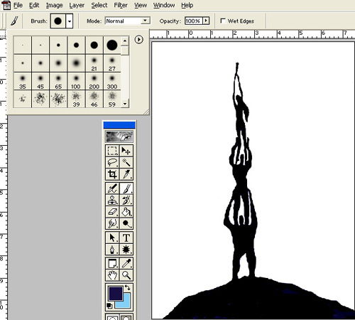 Сначала был сделан набросок простым карандашом, он был отсканирован, и его внутренний контур был закрашен черной кистью с жесткими краями (рис. 12). Как видно из рис. 12, кисть можно подобрать с размытыми и жесткими краями.