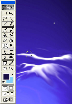 Осталось нарисовать снежные вершины гор. Эта часть фона создавалась с помощью инструмента Smudge Tool. Данный инструмент производит действие, аналогичное эффекту размазывания пастели пальцем. Горы, показанные на рис. 15, были нарисованы в два этапа. Сначала обычной кистью была нарисована белая линия, а затем при помощи инструмента Smudge Tool она была размазана и вытянута в языки, которые имитируют снежные скаты. Инструмент крайне эффективен в работе. Рисуя маслом, подобных эффектов можно добиться, лишь сделав множество мазков, Photoshop же позволяет получить желаемый результат почти мгновенно.