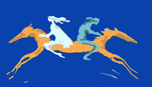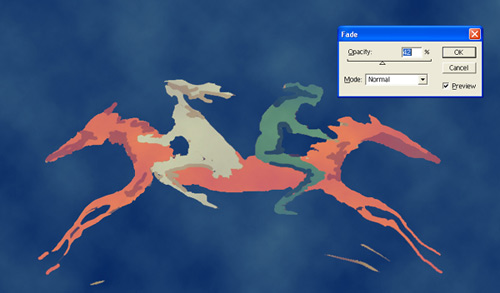 Вначале контуры были нарисованы обычной мышью с использованием палитры из шести цветов. Фигуры настолько просты, что мне удалось обойтись мышью, не прибегая к сканированию набросков традиционным карандашом или использованию планшета. Затем был применен фильтр Difference Clouds по команде: Filter → Render → Difference Clouds, который впоследствии был ослаблен по команде: Edit → Fade Difference Clouds (рис. 20).