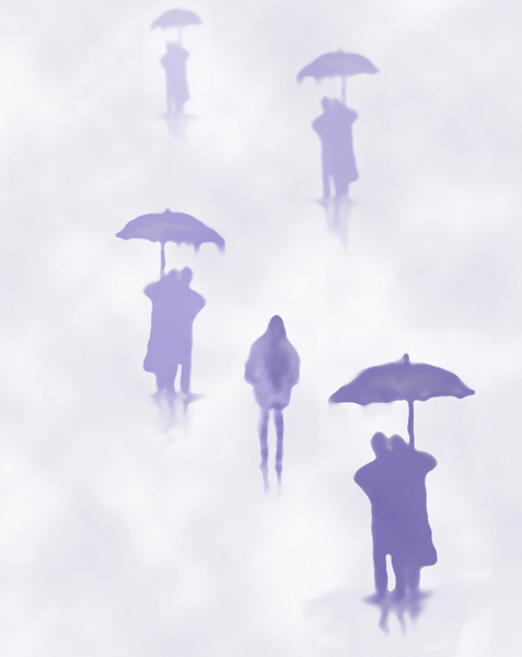 На рис. 26 показан еще один пример — изображение тумана. Данный эффект также создан при помощи фильтров Difference Clouds и Lighting Effects. Причем нетрудно заметить, что фигура под зонтиком нарисована только один раз, а затем скопирована с уменьшением и зеркальным трансформированием при использовании инструмента Free Transform.