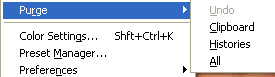 Обычно работа с фильтрами требует достаточно большой оперативной памяти. При этом в памяти хранится информация о копируемых в буфер обмена объектах, вся история ваших действий (система history), благодаря которой вы можете вернуться на несколько шагов и «вспомнить», как выглядело ваше изображение на предыдущих этапах; также отдельно хранится информация, вызываемая по команде Undo. Если во время работы с фильтрами программа сообщит о нехватке памяти, следует воспользоваться командой: Edit → Purge, что приведет к очистке памяти. При этом можно очистить разные разделы памяти, указывая соответствующие параметры: Undo, Clipboard, Histories или все — All (рис. 6).