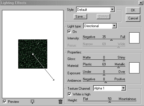 Перейдите на основной слой и примените фильтр Filter→Render→Lighting Effects (Фильтр→Рендер→Эффект света) при параметрах, указанных на рис. 20. Результат должен быть таким, как на рис. 21.