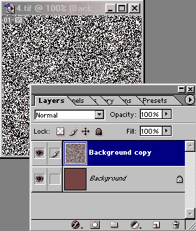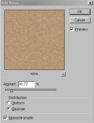 Создайте новый слой Layer2. Залейте его цветом фона и примените фильтр Filter→Noise→Add Noise (Фильтр→умаДобавить шум) при параметрах, как на рис. 41. В результате будет получено изображение, как на рис. 42.
