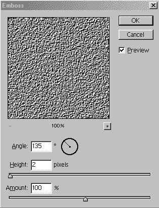 Для удаления цветных точек воспользуйтесь командой Image→Adjustments→Desaturate (Изображение→Регулировки→Уменьшение насыщенности). Выберите Hard Light в качестве режима для нового слоя. Воспользуйтесь фильтром Filter→Stylizes→Emboss (Фильтр→Стилизация→Выпуклый рисунок) при указанных на рис. 24 параметрах. В результате изображение примет вид, как на рис. 25.