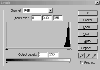 А теперь воспользуйтесь командой ImageаAdjustmentsаLevels (ИзображениеаНастройкиаУровни). Передвиньте средний маркер к самому пику графика (рис. 32). Вследствие этого серые участки на вашем изображении станут более темными и выразительными (рис. 33).