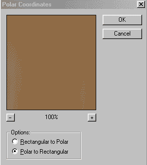 Создайте новое изображение одной из цветовых моделей (RGB, CMYK или Lab). Создайте новый слой Layer1. Выберите основной и фоновый цвета, которые подошли бы для текстуры под дерево (основной темный, фоновый светлый). Используйте фильтр Clouds Filter→RenderаClouds (Фильтр→РендераОблака) (рис. 38). Примените искажение в полярных координатах: Filter→Distort→Polar Coordinates (Фильтр→ИскажениеаПолярные координаты), установив преобразование полярных координат в прямоугольные, как на рис. 39. Результат преобразований можно будет увидеть на рис. 40.